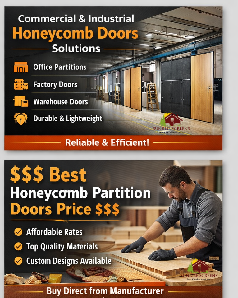 Whether you need the Best honeycomb partition doors for office in Bengaluru, Lightweight honeycomb doors for commercial use in Bengaluru, or Custom honeycomb partition doors for factory in Bengaluru, Sunrise Screens delivers reliable and premium-quality solutions.