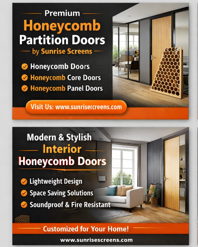 Sunrise Screens is a trusted provider of premium Honeycomb Partition Doors in Hyderabad, offering advanced and durable door solutions for residential, commercial, and industrial spaces. Our high-quality Honeycomb Doors in Hyderabad are designed for lightweight strength, modern aesthetics, and long-lasting performance.