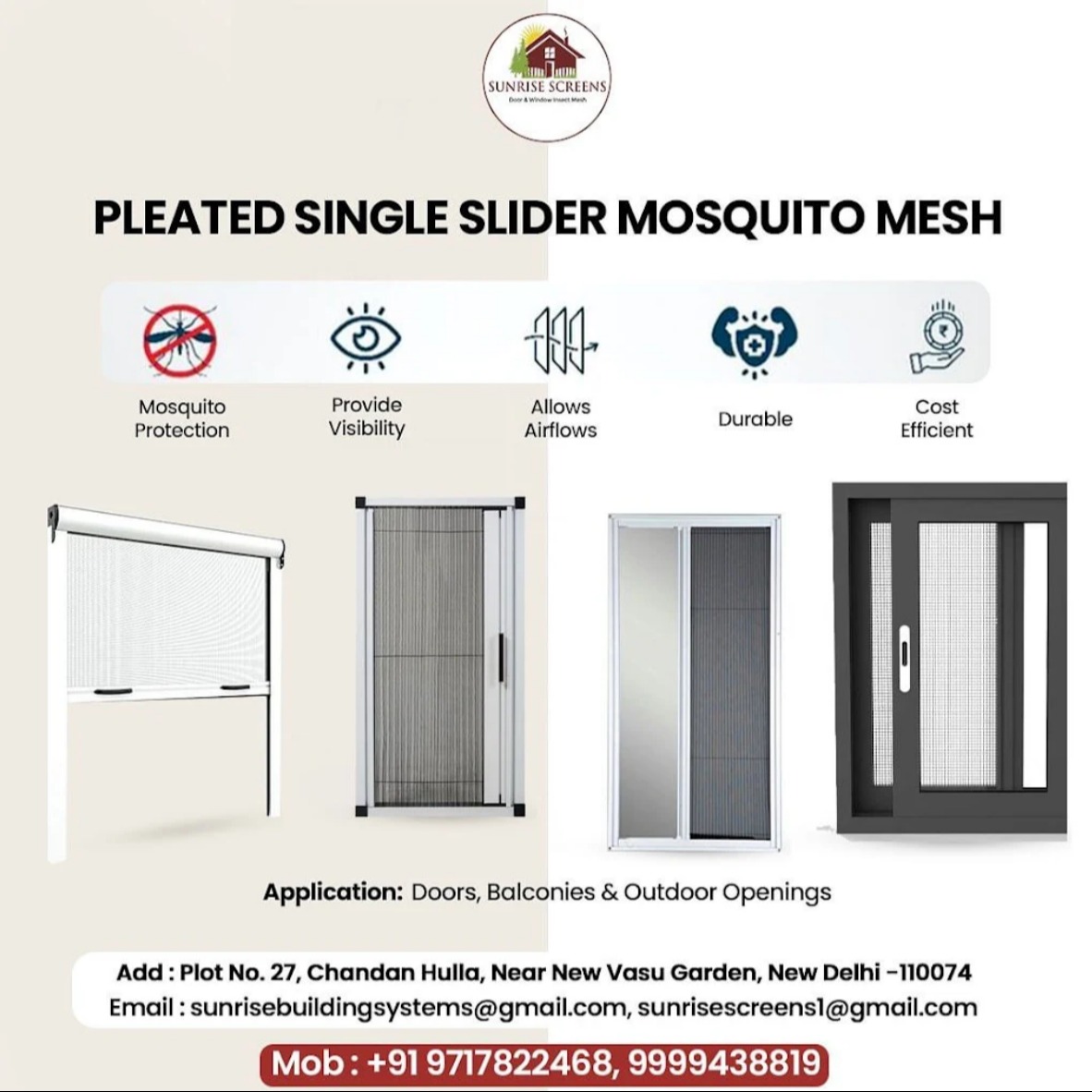Our pleated mesh systems are custom-built to fit any window or door in New Delhi, accommodating irregular shapes and sizes without sacrificing performance. With magnetic locking mechanisms and sleek frames, these systems enhance both safety and aesthetics. Whether installed on balcony doors, French windows, or large sliding doors, they provide unobtrusive protection while allowing fresh air to flow freely. Discover how our pleated mesh solutions combine functionality and design to keep your spaces pest-free without impacting visibility.
