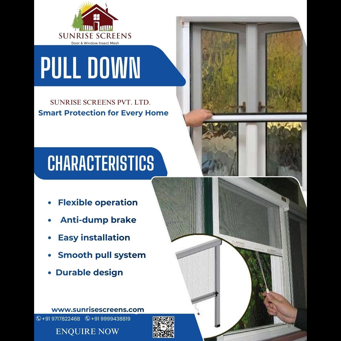 As a trusted name in door and window insect mesh solutions, Sunrise Screens Pvt. Ltd. focuses on quality, performance, and long-term reliability. Our pull-down mesh screens are made from high-grade materials, ensuring easy installation, smooth pull mechanism, and a durable design suitable for Indian weather conditions.